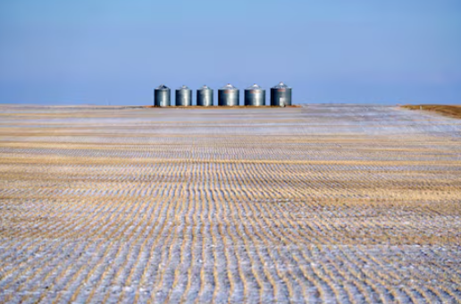 A view of farmers' grain storage bins in a field near Claresholm, Alberta, Canada January 18, 2025.