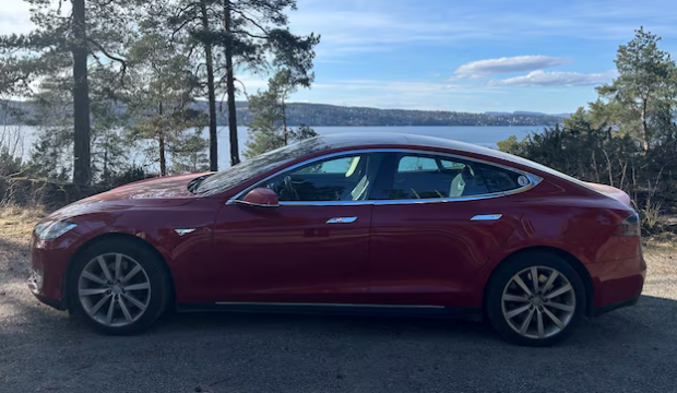 A Tesla Model S is parked in front of Oslofjorden, Oslo, Norway, April 9, 2025.