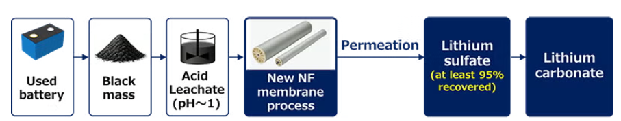 Conventional nanofiltration membranes used for lithium recovery from salt-lake brines lack sufficient resistance to the highly acidic sulfuric acid leachate produced when processing black mass from end-of-life batteries. Toray overcame this limitation through proprietary advances in organic synthesis, polymer chemistry and nanotechnology, creating a membrane that maintains both exceptional acid resistance and precise ion selectivity.