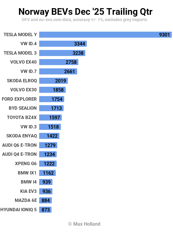 The latest BEV fleet share at the end of Q4 2025 was 32.1%, up from 30.6% at the end of Q3. This is a larger-than-usual quarterly increase, typically around 1%, because December was an exceptionally high-sales month. It is estimated that the diesel fleet share should now have dropped to about 31.5%, and the gasoline fleet share to 24.1%. Hybrid and plug-in hybrid vehicles combined hover around 12.5%, both having now peaked and are slowly declining.