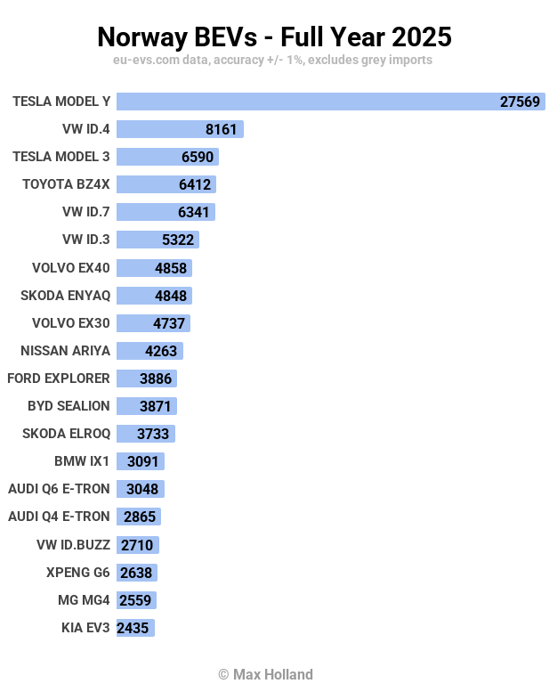 In fact, the Model Y's sales saw a substantial increase from its 2024 total (16,832 units) and expanded its lead in the Norwegian market. This differs from the broader trend in Europe, where the Tesla Model Y, while still the best-selling BEV in 2025, saw its 2025 sales decline compared to 2024.